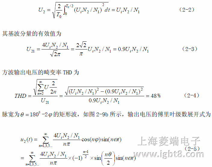 方波中含有幅值為4Ui N2 I(N1π)的基波分量外,還含有較大的低次諧波(3,5,7,9次)分量。該方波輸出電壓的有效值為
