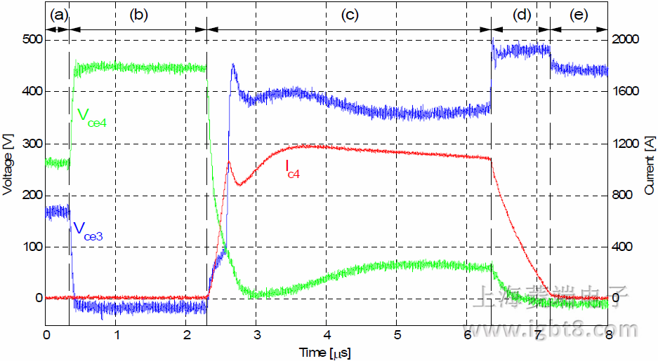 最初,所有的開關(guān)都處于關(guān)斷狀態(tài)(a)。然后導(dǎo)通IGBT S3 (b),則半直流母線電壓435V會施加于IGBT S4 (Vce4),此時無短路電流流過。當(dāng)S4導(dǎo)通時(c),短路電流Ic4流經(jīng)S3和S4,一直增大,直到IGBT S3先退飽和,稍后是S4退飽和。特定的關(guān)斷時序?qū)⒁笙汝P(guān)斷S4,再關(guān)斷S3。但在這里S3會先關(guān)斷(d)。如果不采取保護(hù)措施,短路電流會換流到圖1中的D1和D2,從而導(dǎo)致約870V的全直流母線電壓施加到S3 (Vce3),而這遠(yuǎn)遠(yuǎn)超出了IGBT最大耐壓能力。圖2清楚表明,在關(guān)斷S3的整個關(guān)斷過程中(d),電壓Vce3被鉗在最大值500V。當(dāng)短路電流完全關(guān)斷時,半直流母線電壓435V施加到IGBT S3 (e)。